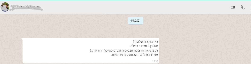 אני פשוט מופתעת...לא ציפיתי לנס הזה. הצטרפתי לפרוייקט הזה אך ורק בגלל התיאור של יונית לילדים שמרטיבים בלילה, זה היה נשמע בדיוק כמו הבן שלי אז החלטתי לנסות, כיוון שאני כבר מיואשת מהכביסות , יום יום של הרטבות לילה.... קודם כל כבר ביום הראשון אני הרגשתי כמה התרגיל עזר לי והרגיע אותי, את העצבים והכעסים. ואני פשוט מאושרת לומר שהילד שבוע שלם *רצוף* קם יבש! זה נס...פשוט ככה. מעבר לזה רב הלילות היו יבשים עד כה מלבד כמה פספוסים...אבל שבוע שלם יבש רצוף זה וואו! יונית, עשית לנו סדר בחיים, הלילות הרבה יותר נעימים, כולם נרדמים יותר בקלות. והילדים לא מוותרים על תרגיל לפני השינה ועל תרגיל נוסף. זה כמובן ימשיך איתנו גם לאחר 30 הימים. בתקווה להמשך יפה ורצוף כמו עכשיו. לסיכום- תודה ענקית! לגמרי שינית לנו את החיים!