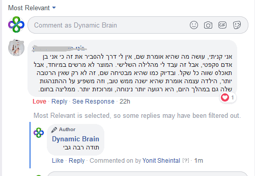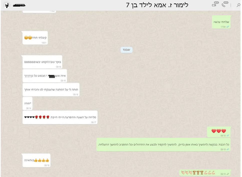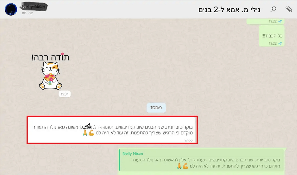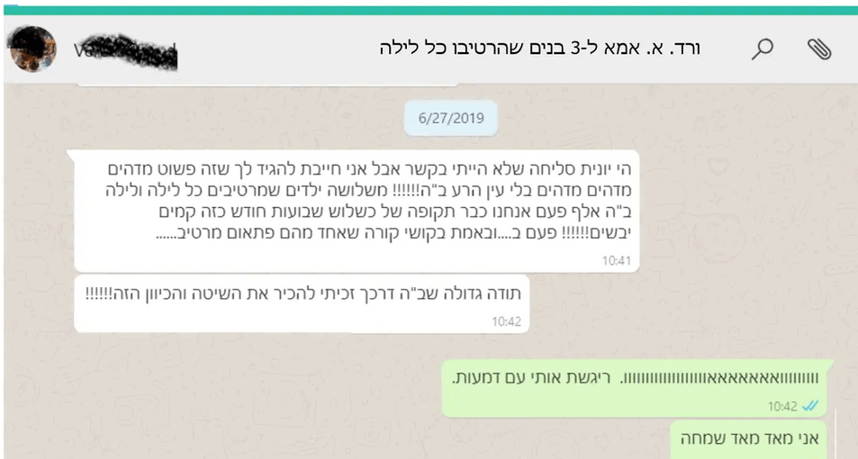 רציתי להגיד תודה על מתנה מווושלמת, בדיוק לתחילת החורף. הבת שלי קמה כבר 3 ימים ברציפות יבשה. אתמול ניסיתי גם עם הבן שאחריה, וזה עבד... אין ספק שאני מרגישה ששידרגת לי את ההורות. ולבת שלי את הדימוי והביטחון העצמי. אני אפרסם את השיטה שלך לכל מכריי, שיזכו גם הם לטעום, טעם של גן עדן. כל כך נעים לי להקדיש כמה דקות של זמן איכות בכל ילד. אין לי מילים להודות.