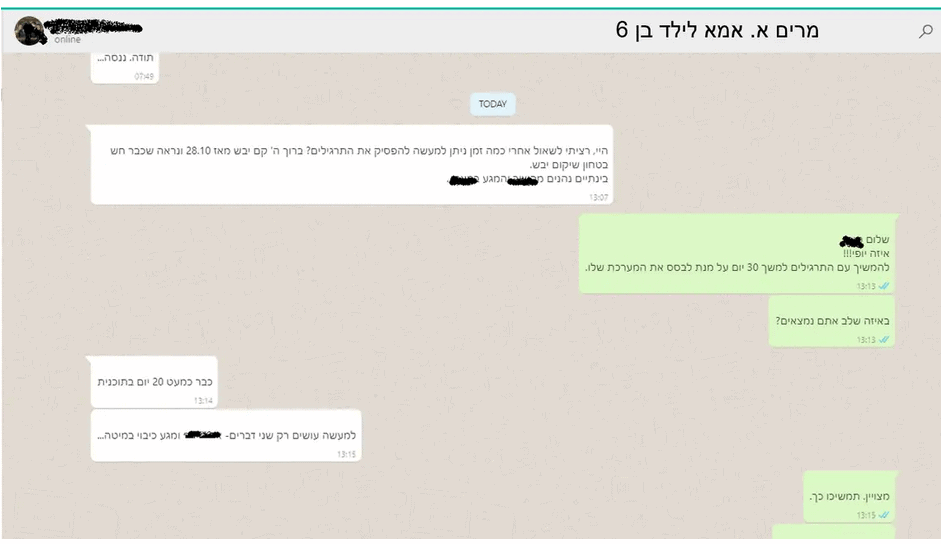 אם את חווה קשיים כלשהם בתהקדמות בתכנית ו/או חוסר שיתוף פעולה או כל קושי אחר, את מוזמנת לפתוח קריאה בדחיפות בתמיכה ושירות לקוחות על מנת לקבל הדרכה מותאמת אישית להתקדמות בהצלחה בתכנית.